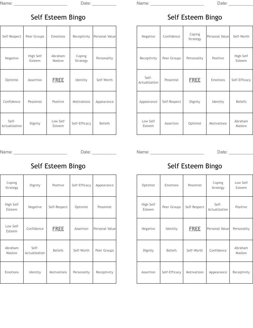 Free Printable Self Esteem Bingo
